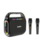 Dual wireless microphones, 100W output power, built-in wireless mic with hands free calls, buil-in DSP, TWS function, RGB lights, 12000mAH battery and buil-in power bank, portable design, remote control